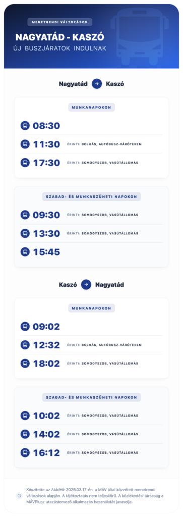 Létrejön a 6126-os Nagyatád – Bolhás – Somogyszob – Kaszó vonal. Nagyatád, Autóbusz-állomásról Kaszó felé munkanapokon 8:30-kor, 11:30-kor és 17:30-kor, szabad- és munkaszüneti napokon 9:30-kor, 13:30-kor és 15:45-kor indulnak járatok. Kaszóról Nagyatád felé munkanapokon 9:02-kor, 12:32-kor, 18:02-kor, szabad- és munkaszüneti napokon 10:02-kor, 14:02-kor és 16:12-kor indulnak a buszjáratok.